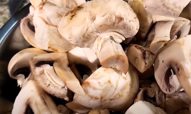 Нарежьте 450 г шампиньонов на четыре части (если грибы крупные), или пополам (если средние), либо оставьте целыми (если маленькие). Грибы промойте или протрите бумажным полотенцем. Счищать шкурку не нужно. Мелко нарежьте половину луковицы, чтобы лук растворился в соусе. Подготовьте 2 зубчика чеснока и немного свежей петрушки. Разогрейте стальную или чугунную сковороду с небольшим количеством подсолнечного масла. Когда сковорода хорошо разогреется, добавьте грибы и обжаривайте их 2-3 минуты, не мешая, чтобы они подрумянились.