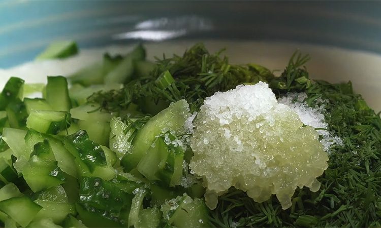 Натрите кабачки на терке, посыпьте их солью и оставьте в дуршлаге на 10 минут. Затем тщательно отожмите кабачки, чтобы удалить лишнюю жидкость. Мелко нарежьте репчатый лук, укроп и листья мяты. Добавьте их в отжатые кабачки. В эту же смесь добавьте измельченную брынзу и яйца. Хорошо перемешайте. Постепенно всыпьте пшеничную муку, тщательно перемешивая, чтобы получилось однородное тесто.