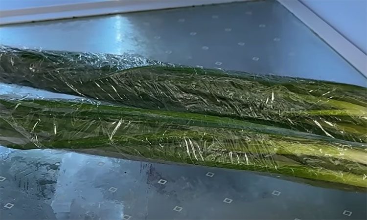 Промойте зеленый лук в растворе воды и пищевой соды. Это удалит возможные химикаты. Ополосните лук и тщательно обсушите. Можно использовать бумажные полотенца. Разделите лук на небольшие порции и заверните в пищевую пленку. Убедитесь, что листья не переламываются. Храните завернутый лук в холодильнике. Он останется свежим в течение месяца.