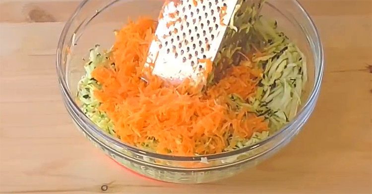 1. Натрите кабачки на крупной терке, морковь на мелкой. Поместите натертые овощи в большую миску.