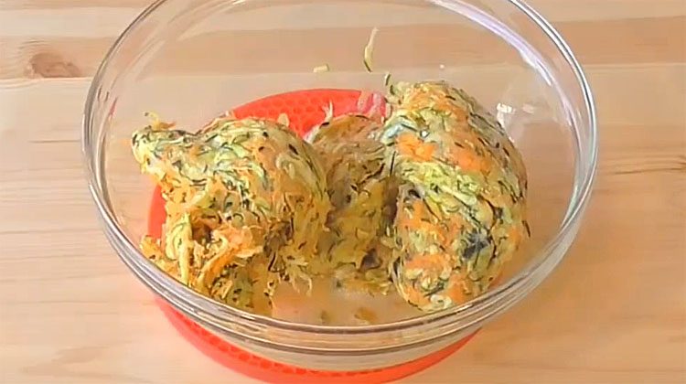 2. Добавьте к овощам щепотку соли и хорошо перемешайте. Оставьте овощи на 20 минут, чтобы они дали сок. Переложите натертые овощи в марлю или чистое кухонное полотенце. Тщательно отожмите овощи, чтобы удалить лишний сок. Это важно для того, чтобы оладьи не получились слишком жидкими.