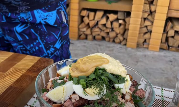 Мелко нарежьте один пучок укропа и петрушки. Отварите и нарежьте 3 картофеля и 4 яйца. Натрите на крупной терке 2 огурца и редиску. Возьмите 500 г куриных бедер, посолите и поперчите по вкусу. Замаринуйте их с уксусом, как в классическом советском варианте шашлыка. Затем пожарьте мясо на углях до готовности и нашинкуйте мелкими кусочками. Добавьте мясо к нарезанным овощам и зелени.