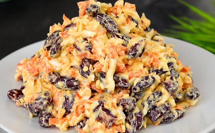 Отварные яйца на крупной терке сразу пропускаем в салатник. Сюда же измельчаем на той же терке морковь и выкладываем фасоль. Сыр предварительно лучше подержать в морозилке 5 минут, а затем тоже на терке пропустить в салатник.