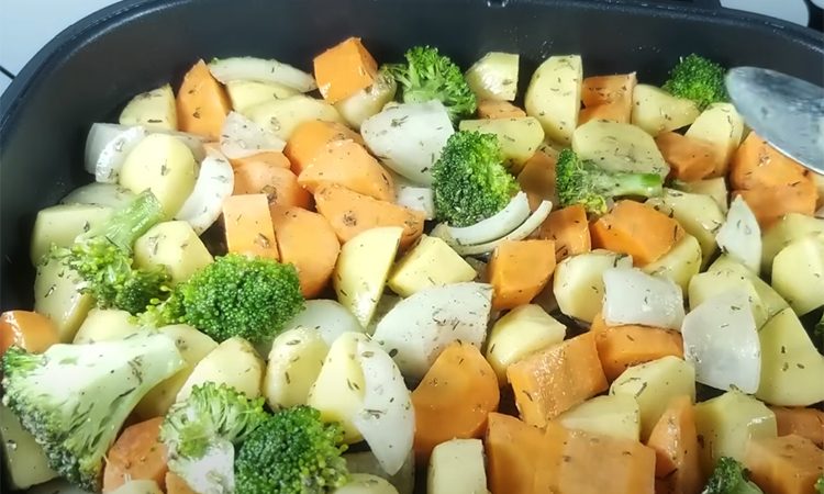 Разогрейте сковороду в течение 30 секунд на сильном огне. Выложите в нее овощи, пусть поджарятся минуту. Через 30 секунд снизьте температуру до средней. Закройте крышку и готовьте 15 минут. После этого перемешайте и готовьте еще 15 минут. Овощи можно приготовить и в духовке. Запекать нужно при 200 градусах 35 минут. Для фритюрницы температуру возьмите ту же, но готовьте всего 20 минут.