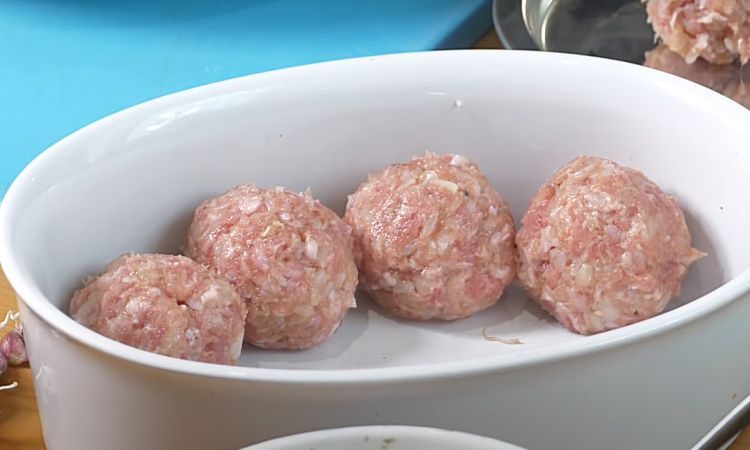 2. Сформируйте из фарша тефтели среднего размера и выложите их в глубокую форму для запекания.