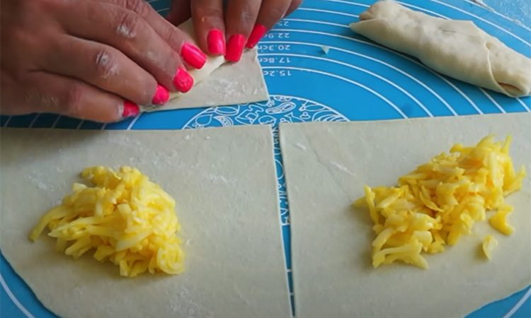В глубокой миске смешайте теплую воду, сахар и соль. Введите дрожжи, затем муку и растительное масло. Замешайте плотное тесто и оставьте его отдыхать на 30 минут под пленкой. Затем раскатайте в тонкий пласт и разрежьте на треугольники. В отдельную емкость натрите сыр.