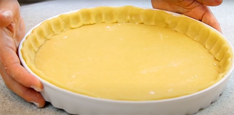 4. Достаньте тесто из холодильника и раскатайте его на присыпанной мукой поверхности до толщины около 0.5 см. Форму для выпечки выстелите пергаментной бумагой. Выложите тесто в форму, сформируйте бортики высотой около 3-4 см. Наколите тесто вилкой, чтобы оно не пузырилось при выпечке. Выпекайте основу в разогретой до 180 градусов духовке около 10 минут.
