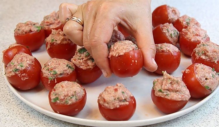2. Вымойте 1 кг помидоров черри. Отрежьте верхушки и аккуратно выньте сердцевину ложкой. Немного посолите внутри, переверните помидоры на бумажное полотенце, чтобы стек сок.