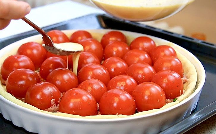 Тонкий слой теста, помидоры черри, фаршированные мясом, и нежная сырно-сливочная заливка — этот пирог точно останется в памяти вашей семьи. Этот пирог не только невероятно вкусен, но и удивительно прост в приготовлении. Достаточно залить помидоры и мясо изысканным соусом и отправить в духовку.
