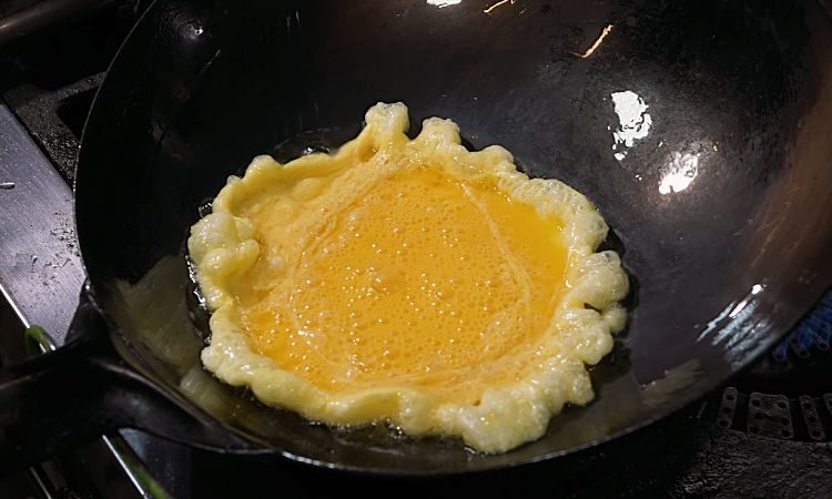 2. Разогрейте на среднем огне масло в сковороде. Влейте взбитые яйца в разогретое масло. Постоянно помешивайте яйца, чтобы они равномерно приготовились и не пригорели. Когда яйца схватятся и будут готовы, переложите их в отдельную миску и отложите в сторону.
