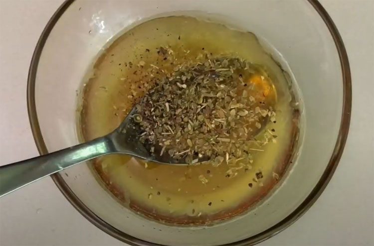 3. Возьмите небольшую миску. Добавьте 2 чайные ложки меда, выдавите сок из половины лимона и добавьте его в миску. Влейте 4 чайные ложки растительного масла. Добавьте соль, перец и сушеный базилик. Тщательно перемешайте все ингредиенты, чтобы мед полностью растворился.