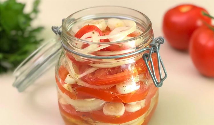 Закуска из лука и помидоров получается невероятно вкусной, умеренно соленой, острой и пикантной. С течением времени её вкус становится ещё лучше.