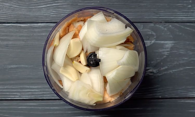 2. Очистите и нарежьте крупными кусками 200 г лука. Очистите 5 зубчиков чеснока. Добавьте лук и чеснок в блендер к батону. Измельчите все ингредиенты в блендере до состояния однородного пюре.