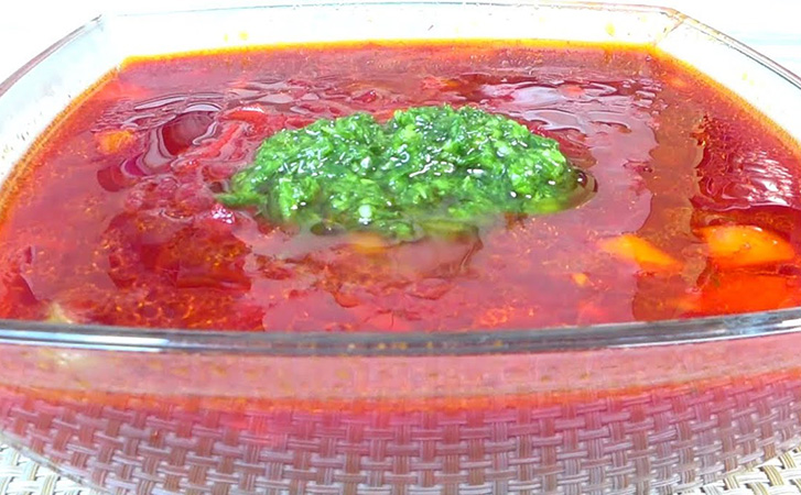 Приготовьте заправку: мелко нарежьте сладкий перец, натрите чеснок, добавьте чёрный и острый перец. Нагрейте масло и залейте им смесь перцев и чеснока. Дайте настояться. Выложите заправку в свекольник и хорошо перемешайте. Добавьте консервированную фасоль вместе с жидкостью. Залейте кипятком или бульоном до нужной густоты. Варите 10 минут.