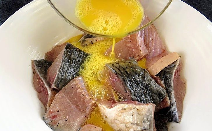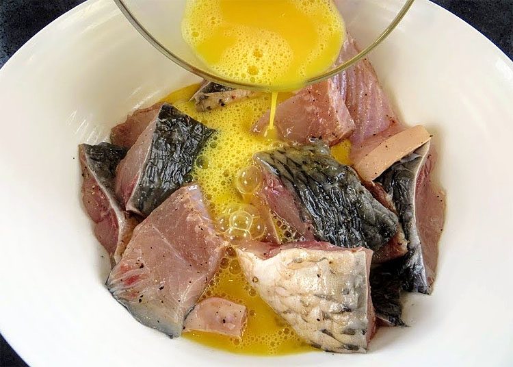 1. Очистите рыбу от чешуи, удалите внутренности и промойте под холодной водой. Нарежьте рыбу на кусочки среднего размера. Выложите кусочки рыбы в глубокую миску. Посолите и поперчите по вкусу, тщательно перемешайте.
