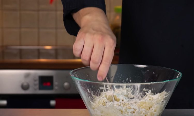 Натрите картофель на мелкой тёрке прямо в воду, чтобы он не темнел. Затем слегка промойте картофель в той же воде. Откиньте натёртый картофель на дуршлаг и дайте воде стечь. Затем тщательно отожмите картофель, чтобы удалить лишнюю влагу. Натрите лук на самой мелкой тёрке до состояния кашицы и добавьте его к отжатому картофелю.