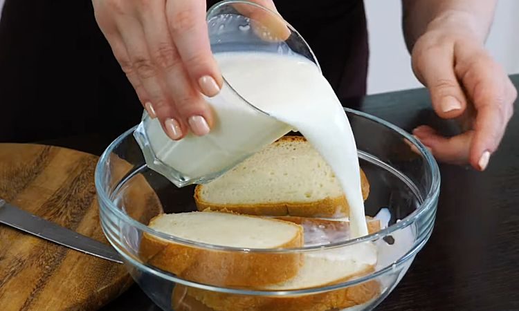 1. Нарежьте 100 г батона на небольшие кусочки. Положите нарезанный хлеб в миску и залейте 100 мл молока. Оставьте хлеб замачиваться на 10-15 минут, чтобы он полностью пропитался молоком. После этого отожмите лишнюю жидкость из хлеба.