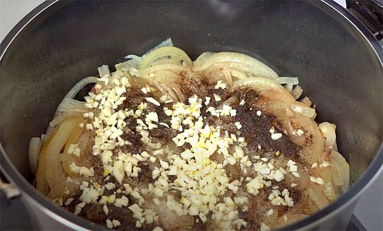 5. Через час откройте крышку и добавьте соль, черный перец и измельченный ножом чеснок. Перемешайте содержимое казана, чтобы специи равномерно распределились.