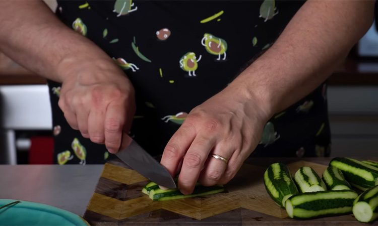 Подготовка огурцов: Срезаем концы у свежих огурцов и очищаем их от кожуры, оставляя полоски для создания «зебры». Нарезаем огурцы пополам, затем на кусочки.