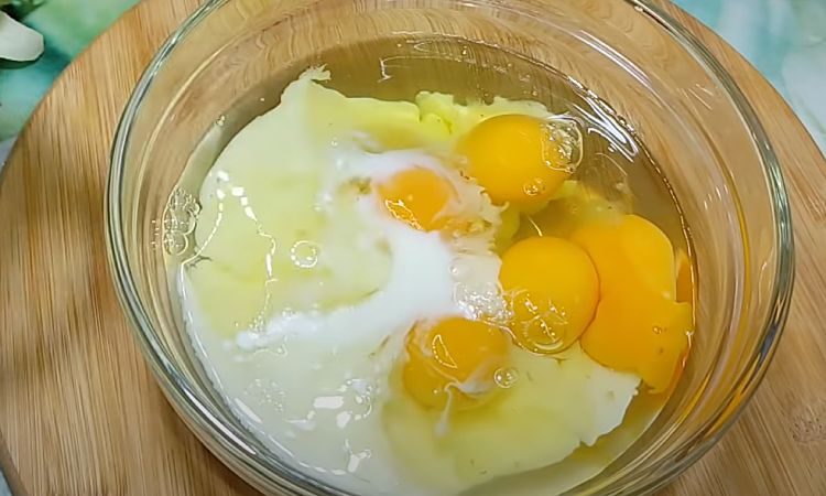 3. В глубокой миске взбейте 5 яиц. Добавьте 100 мл молока к яйцам и хорошо перемешайте венчиком или вилкой. Посолите смесь, добавив 1 чайную ложку соли, и поперчите по вкусу. Добавьте 2 столовые ложки растительного масла и 2 столовые ложки крахмала. Хорошо перемешайте до однородности. Всыпьте мелко нарезанную зелень (кинзу и укроп) в яичную смесь и снова перемешайте.