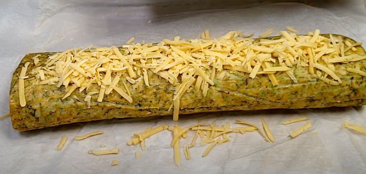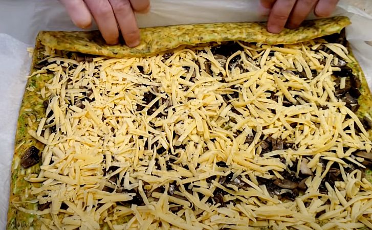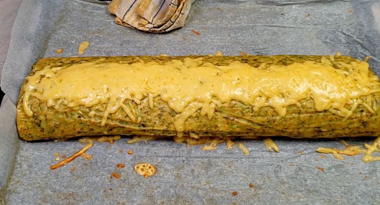 5. Осторожно начните скручивать кабачковый рулет, начиная с одного конца, используя пергамент для помощи. Постарайтесь сделать рулет плотным и аккуратным. Сверху посыпьте оставшимся сыром.