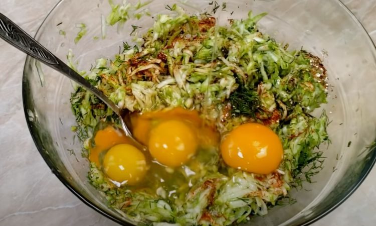 1. Терем кабачки на крупной терке и отжимаем от лишней влаги. Смешиваем кабачки с мукой, специями и яйцами до получения консистенции теста.
