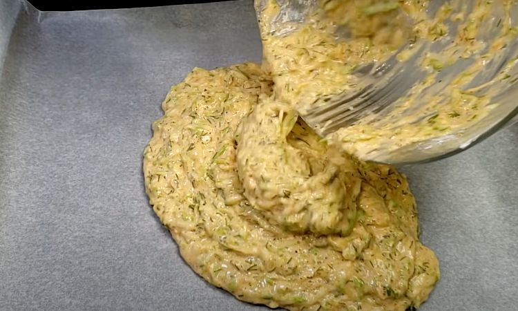3. На противне, выстеленном пергаментной бумагой, равномерно распределите кабачковое тесто в тонком слое. Перенесите противень в разогретую до 200 градусов духовку и запекайте ровно 20 минут.