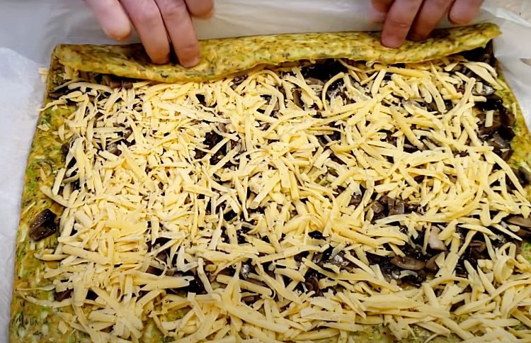 4. Через 20 минут вынимаем кабачковый рулет из духовки. Пока кабачки еще не остыли, выложите обжаренные грибы на тесто в равномерном слое, оставив небольшой отступ от краев. Посыпьте тертым твердым сыром поверх грибов. Немного сыра оставьте для присыпки сверху.