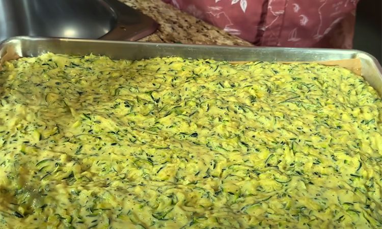 Натрите кабачки на крупной терке, добавьте столовую ложку крупной соли и оставьте на 10 минут, чтобы овощи отдали лишнюю жидкость. Тем временем мелко нарежьте луковицу и обжарьте на минимальном огне в кастрюле с высокими бортиками. Отожмите лишнюю жидкость из кабачков и добавьте их в миску. В отдельной миске взбейте три яйца, добавьте кефир, соль, перец, сушёные специи и тщательно перемешайте.