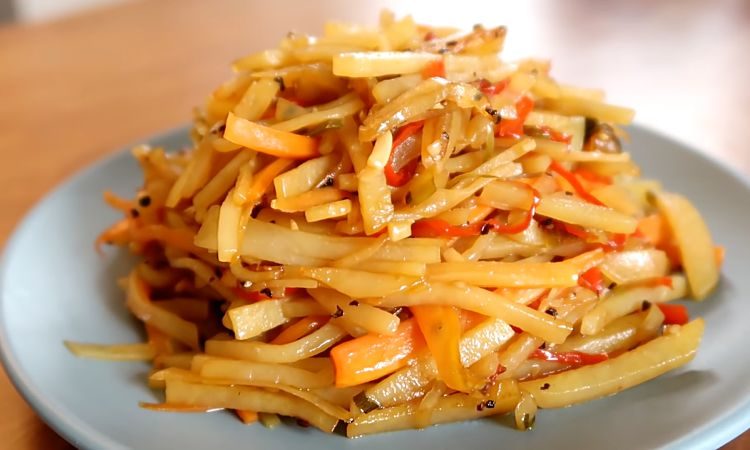 Гениальное блюдо: можно подать на гарнир, а можно и как закуску. Соединяем картофель и морковь соломкой