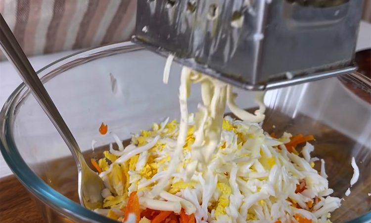 Сначала возьмите готовую морковь по-корейски и отправьте ее в глубокую миску, предварительно слив лишнюю жидкость. Затем натрите отварные яйца на крупной терке прямо в миску. Следом берите подмороженные плавленые сырки и также натрите их на крупной терке.