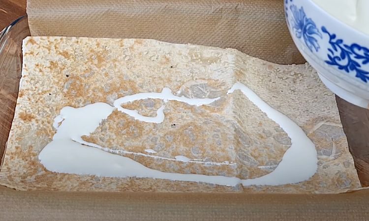 4. Подготовьте форму для запекания: смажьте дно и бока небольшим количеством растительного масла. Выложите первый лист лаваша на дно формы, так чтобы его края немного заходили на стенки формы. Нанесите на лаваш слой сметанного соуса, равномерно распределяя его по всей поверхности.