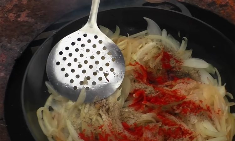 Когда лук начнёт выделять сок и станет мягким, добавьте черный перец, паприку и приправу для шашлыка. Продолжайте обжаривать до полной готовности, периодически помешивая.