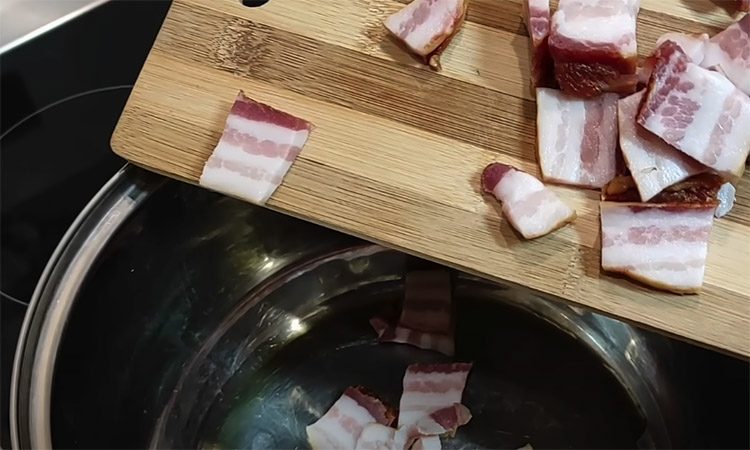 Начните с того, что поставьте кастрюлю на сильный огонь и добавьте в неё столовую ложку оливкового масла. Нарежьте подкопченную свиную грудинку небольшими квадратиками и отправьте в кастрюлю. Обжаривайте мясо, пока оно не начнет выделять жир, который станет основой для дальнейшего приготовления. Затем нарежьте копченую грудинку соломкой и добавьте её к первому мясу.