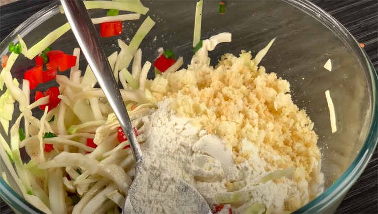 3. Добавьте муку, панировочные сухари и еще раз тщательно перемешайте, чтобы мука равномерно распределилась по всей массе. Это придаст блюду хрустящую корочку при жарке.