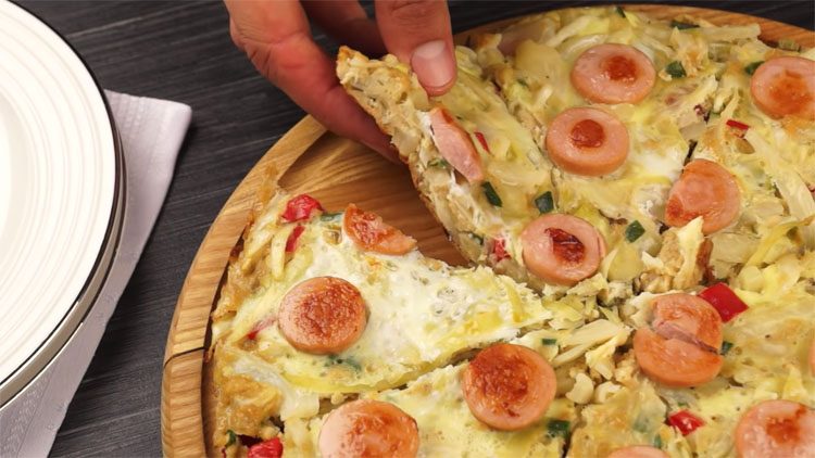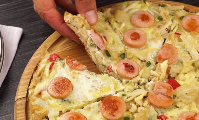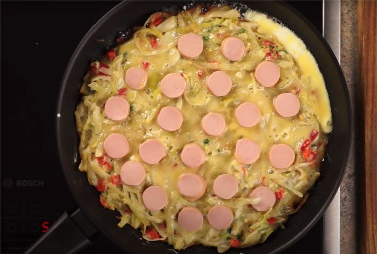 5. Взболтайте второе яйцо в отдельной миске. Равномерно распределите взбитое яйцо по поверхности жарящегося блюда. Сразу выложите нарезанный сосиски на еще не схватившийся белок, распределяя их равномерно.