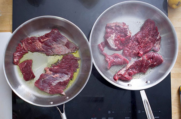 В рамках первого эксперимента мы сравним, как скерт-стейк жарится на рапсовом и на оливковом масле. В процессе жарки оба масла достигают своей точки дыма, однако это не оказывает негативного влияния на конечный результат — в обоих случаях стейк получается на высоте и готов к подаче на стол. Тем не менее, нейтральное рапсовое масло сохраняет оригинальный вкус мяса, тогда как оливковое масло добавляет особый вкус, придавая блюду дополнительные нотки. Этот эффект гораздо более выражен, чем если бы вы просто полили готовый стейк сверху несколькими ложками оливкового масла. Поэтому выбор масла в данном случае зависит от ваших личных вкусовых предпочтений и того, насколько вам важен дополнительный аромат.
