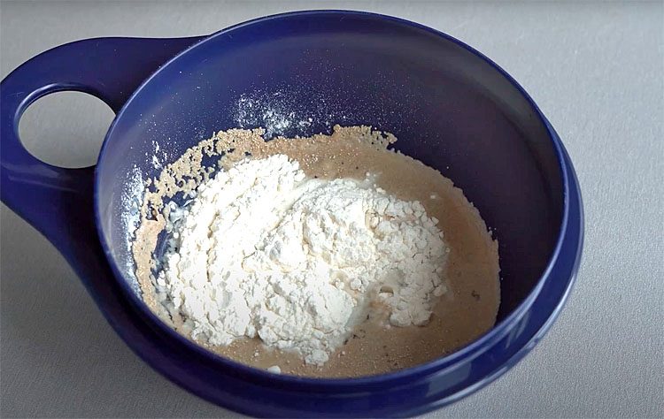 1. В небольшую миску налейте 100 мл тёплой воды. Температура воды должна быть около 35-40°C, чтобы активировать дрожжи. Добавьте в воду 1/2 ч. ложки сахара. Сахар поможет дрожжам быстрее активироваться. Затем добавьте 1 ч. ложку сухих дрожжей. Размешайте до растворения дрожжей. Всыпьте 2 ст. ложки муки и тщательно перемешайте, чтобы не было комочков. Накройте миску с опарой крышкой или плёнкой и поставьте её в тёплое место на 20-30 минут. Опара должна увеличиться в объёме и покрыться пузырьками.