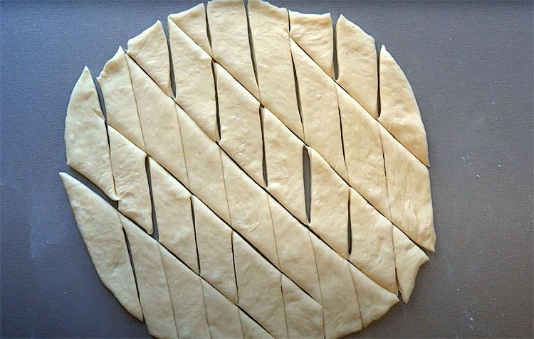 5. Каждую часть раскатайте в круг толщиной около 1 см. Не раскатывайте тесто слишком тонко, чтобы баурсаки оставались пышными. Нарежьте раскатанный пласт теста на небольшие ромбы или квадраты. Размер кусочков может варьироваться по вашему вкусу, но традиционно они небольшие.