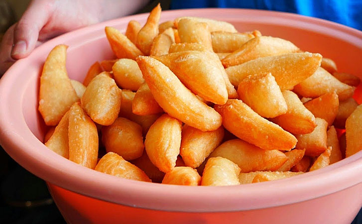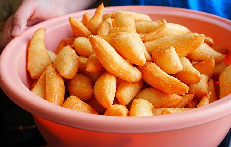 6. В казанке или глубоком сотейнике разогрейте 300 мл растительного масла. Масло должно быть хорошо прогрето, но не перекалено. Чтобы проверить температуру, опустите в масло небольшой кусочек теста — если вокруг него сразу появляются пузырьки, масло готово к жарке. Аккуратно опускайте нарезанные кусочки теста в горячее масло. Не кладите слишком много сразу, чтобы баурсаки свободно плавали в масле. Обжаривайте баурсаки до золотистого цвета, переворачивая их по мере необходимости. Процесс жарки займёт всего несколько минут, поэтому следите за тем, чтобы они не подгорели.