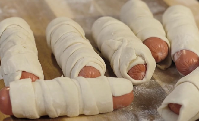 3. Возьмите одну сосиску и оберните ее тестом, начиная с одного конца и постепенно накручивая полоску по спирали, слегка перекрывая слои друг на друга. Убедитесь, что тесто плотно прилегает к сосиске. Повторите процесс со всеми сосисками.