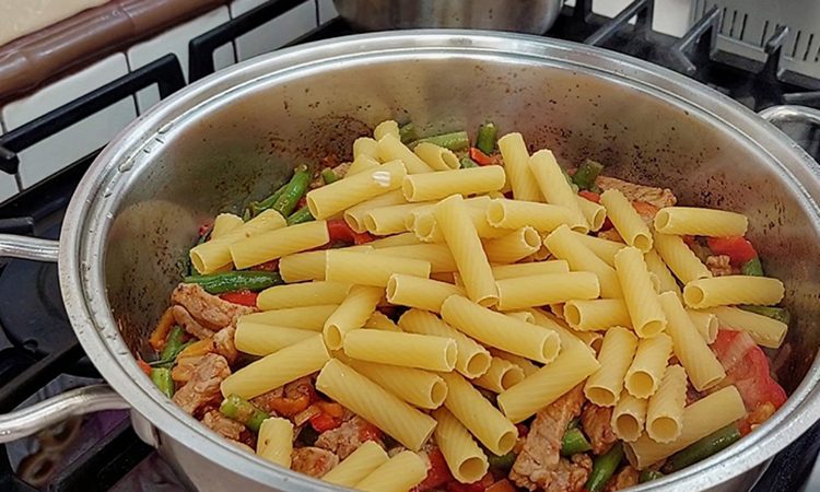 Все хорошо перемешайте и тушите еще 5-7 минут под крышкой. Затем добавьте макароны, залейте их кипятком так, чтобы они были полностью покрыты, и хорошенько перемешайте. Подсалите по вкусу и добавьте немного черного перца.