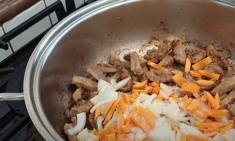 Разогрейте сковородку или сотейник на среднем огне, добавьте растительное и сливочное масло. Нарежьте телятину на небольшие кусочки и обжарьте до золотистой корочки. Пока мясо обжаривается, нарежьте лук полукольцами, а морковь — на брусочки. Добавьте их к мясу, слегка подсолите, всыпьте пол чайной ложечки сахара для баланса вкусов и перемешайте.