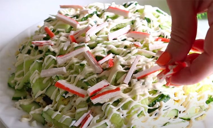 Следом выкладываем натёртые на крупной тёрке яйца, добавляем сеточку из майонеза и нарезанные тонкой соломкой огурцы. Снова майонез и оставшиеся крабовые палочки. Завершаем сеточкой из майонеза и посыпаем мелко нарубленной петрушкой.