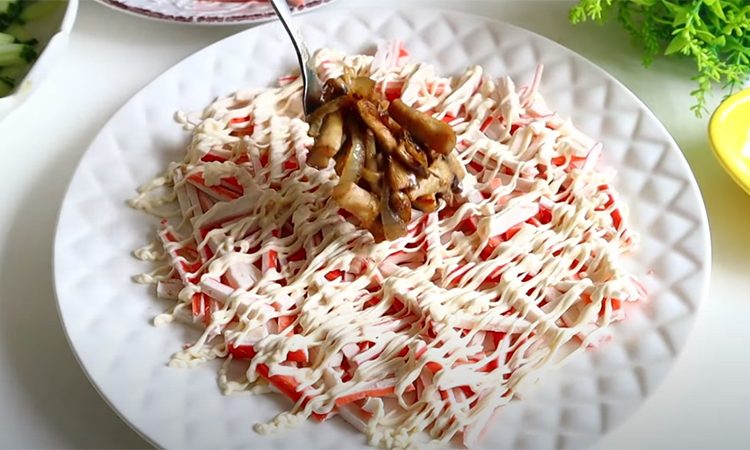 Начните сборку салата: на блюдо нанесите сеточку из майонеза и выложите большую часть крабовых палочек. Добавьте немного майонеза (по желанию с чесноком) и второй слой — грибы, сверху нанесите небольшую сеточку из майонеза.