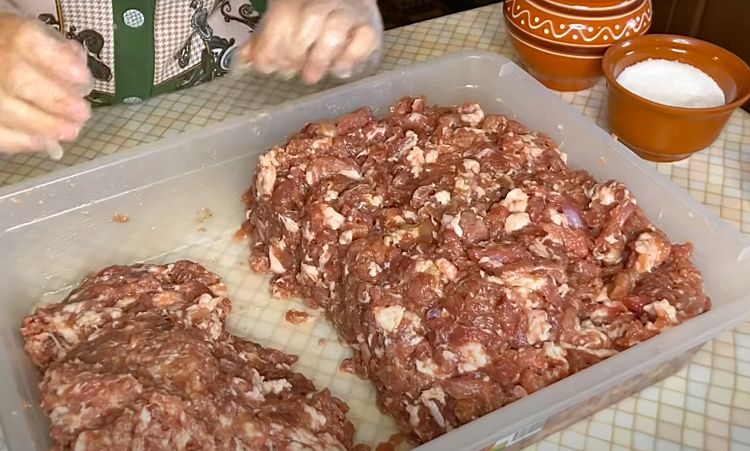 Шаг 2: Подготовка фарша. В большой миске смешайте измельченное мясо с нитритной солью (10 г), поваренной солью (10 г) и ледяной водой (80 мл). Ледяная вода помогает сохранить фарш более сочным. Вымешивайте фарш руками не менее 5–7 минут. Это важно для того, чтобы мясо хорошо пропиталось солью и специями. Начинайте отбивать фарш руками. Для этого поднимите часть фарша и резко бросьте его обратно в миску. Повторяйте эту процедуру несколько раз – это улучшит консистенцию колбасы и поможет лучше сохранить форму. Добавьте любимые специи по вкусу (например, молотый черный перец, кориандр, чеснок). Специи можно корректировать по вашему предпочтению.