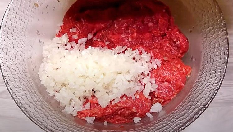 3. Очистите одну луковицу и нарежьте ее как можно мельче. Лучше использовать очень мелкий кубик, чтобы лук равномерно распределился в котлетах и не создавал крупных кусочков. Достаньте замаринованный фарш из холодильника и добавьте к нему нарезанный лук. Снова тщательно перемешайте массу руками, чтобы лук равномерно распределился по фаршу.
