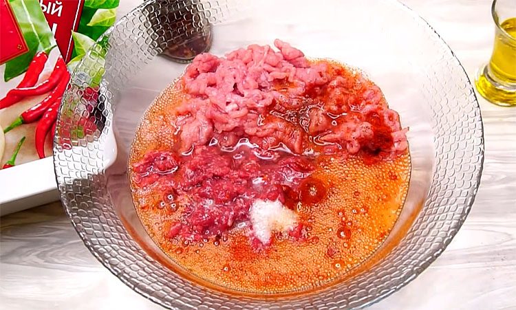 1. В большую миску положите 300 граммов свиного фарша и 300 граммов говяжьего фарша. Хорошо перемешайте мясо руками или вилкой, чтобы ингредиенты равномерно распределились. Добавьте в фарш 1 чайную ложку соли, 1/3 чайной ложки черного молотого перца, 1/2 чайной ложки сладкого молотого перца и острый перец чили по вкусу. Тщательно перемешайте фарш с добавленными специями, чтобы они равномерно распределились по всей массе. Влейте 150 мл газированной воды в фарш. Это придаст котлетам дополнительную мягкость и сочность. После добавления воды снова тщательно перемешайте фарш, пока он не станет однородным.