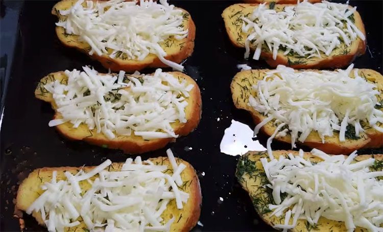 3. Смажьте противень небольшим количеством масла. Это предотвратит прилипание и придаст хрустящую корочку. Выложите пропитанные ломтики батона на противень в один слой. Сверху на каждый ломтик равномерно распределите натертый сыр. Постарайтесь покрыть каждый ломтик достаточно большим слоем сыра для лучшего вкуса.