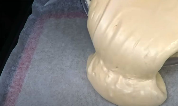 Добавьте ванильный экстракт. В три приёма введите просеянную муку с разрыхлителем, аккуратно перемешивая движениями снизу вверх. Влейте тонкой струйкой растительное масло, вмешивая его в тесто. Вылейте тесто на противень и разровняйте.
